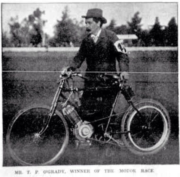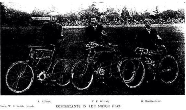 ‘TP O’Grady was off scratch, W Courtney 30 seconds, A Allison 50 and W Baulderstone 1 min 5 sec. Baulderstone was away well and had almost completed a lap when O’ Grady was pushed off. Courtney retired early with a mechanical problem. O’ Grady’s machine took a while to get going, but when it did it was soon seen to be the fastest machine on the track. It lapped the others three times in the 15 laps and covered some of the circuits in 32 and 33 seconds. Its fastest pace was at the rate of 1 min 32 sec for the mile, or 30 miles per hour. O’ Grady an old time racing man, who constructed the motor himself at Mr V Lewis cycle works, was loudly cheered as he finished his five miles journey in 9 min 10 secs. Just after he crossed the line the belt of his motor broke. There was an interesting run for second place between Allison and Baulderstone. The latters machine lost the pace with which it started, and Allison was able to keep ahead’.