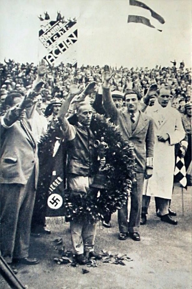 Tazio made up time in the winding and downhill sections where the greater engine power of the German machines could not be successfully deployed. Nuvolari then passed Von Brauchitsch, Mercedes W25B for third on the outside of the Karussell, Brauchitsch regained the place on the following lap.