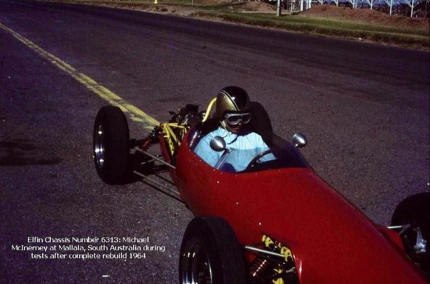 The day after the 1965 speed record trials (Labour Day October 1965), McInerney raced the twin-Norman supercharged Elfin at Mallala in Formule Libre as there was insufficient time to revert the engine back to Formula II specifications. The photo above shows McInerney at Mallala.