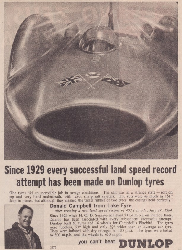 (S Dalton Collection)Australian motoring/racing journalist, racer and rally driver Evan Green project managed the successful July 1964 record attempt on behalf of Oz oil company Ampol, who were by then Bluebird’s major sponsor. He wrote a stunning account of his experience that winter on the Lake Eyre salt which was first published in Wheels April 1981 issue.