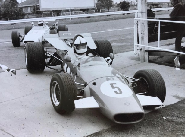 Harvey in BT23E returning to the Sandown paddock during the September 1969 Gold Star meeting, an event he won. A good win too, from Bartlett’s Sub and Niel Allen’s McLaren M4A Ford FVA. That’s Henk Woelders’ Elfin 600B Ford behind.