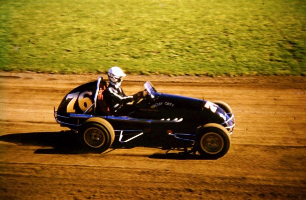 Aboard the McKay Offenhauser at the Sydney Showgrounds in the early sixties.