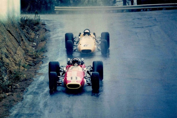 No time to wave to Ron MacKinnon as John plunges past his ‘Mountford’ property on the run down to the Viaduct during the very wet final Longford in March 1968. Not a place for the faint of heart at any time let alone in the pissin’ rain. Brabham BT11A Repco.