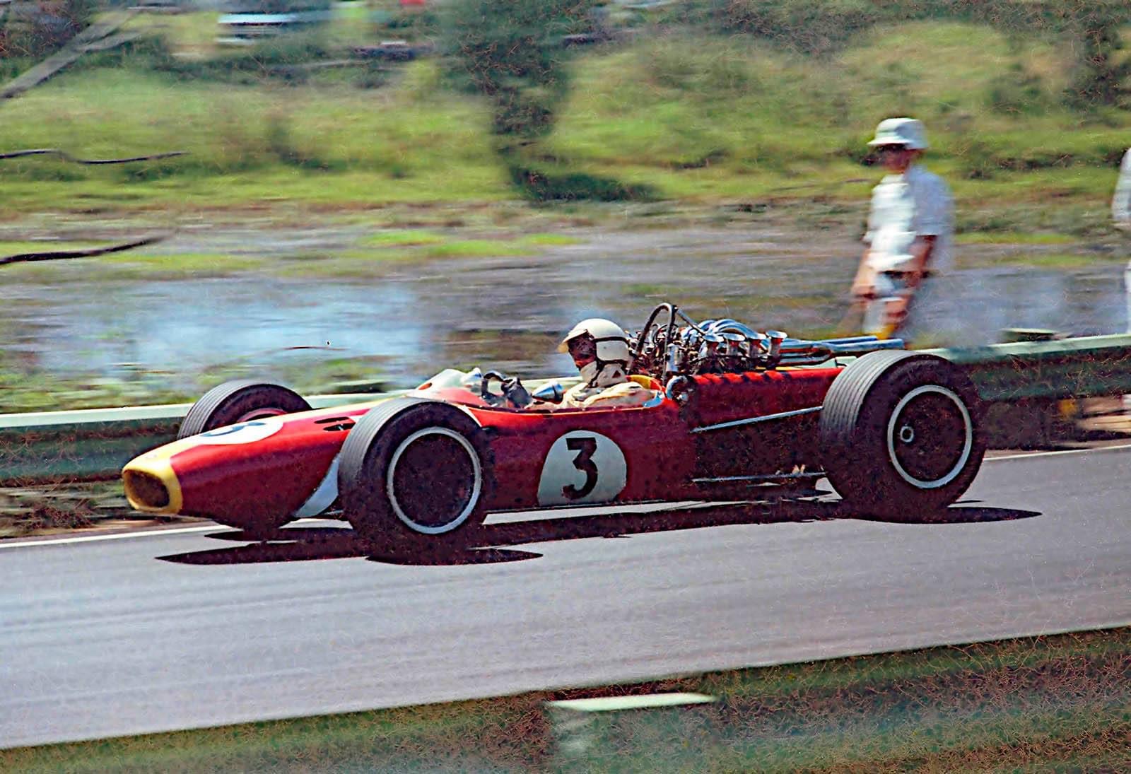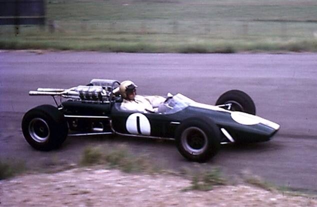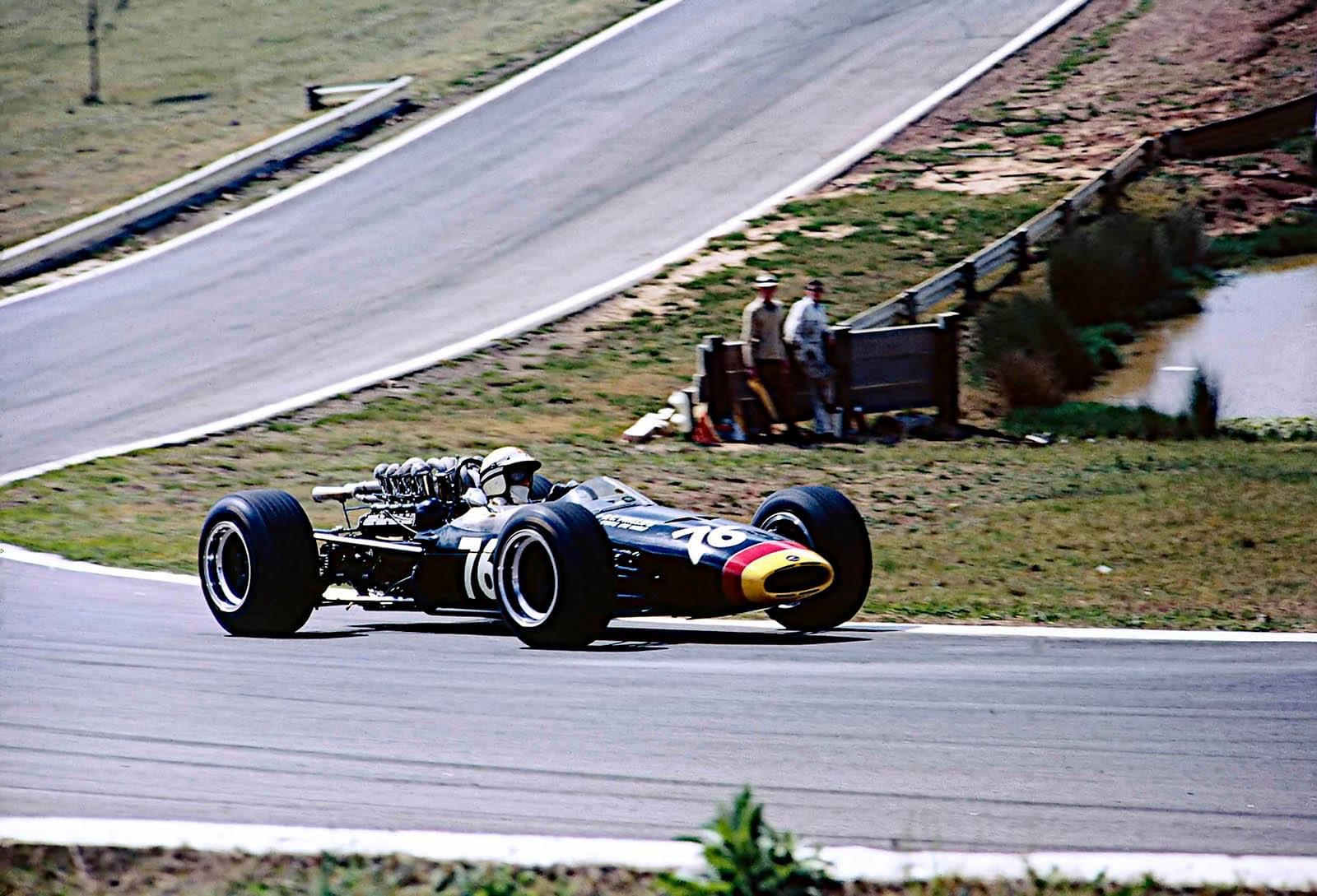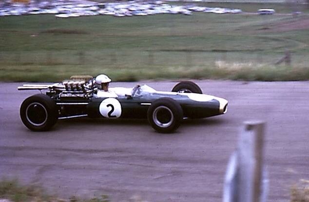 JH in Bob Janes BT11A Repco 740 crossing WF’s Causeway during the February 1968 Warwick Farm 100 Tasman round (D Simpson)