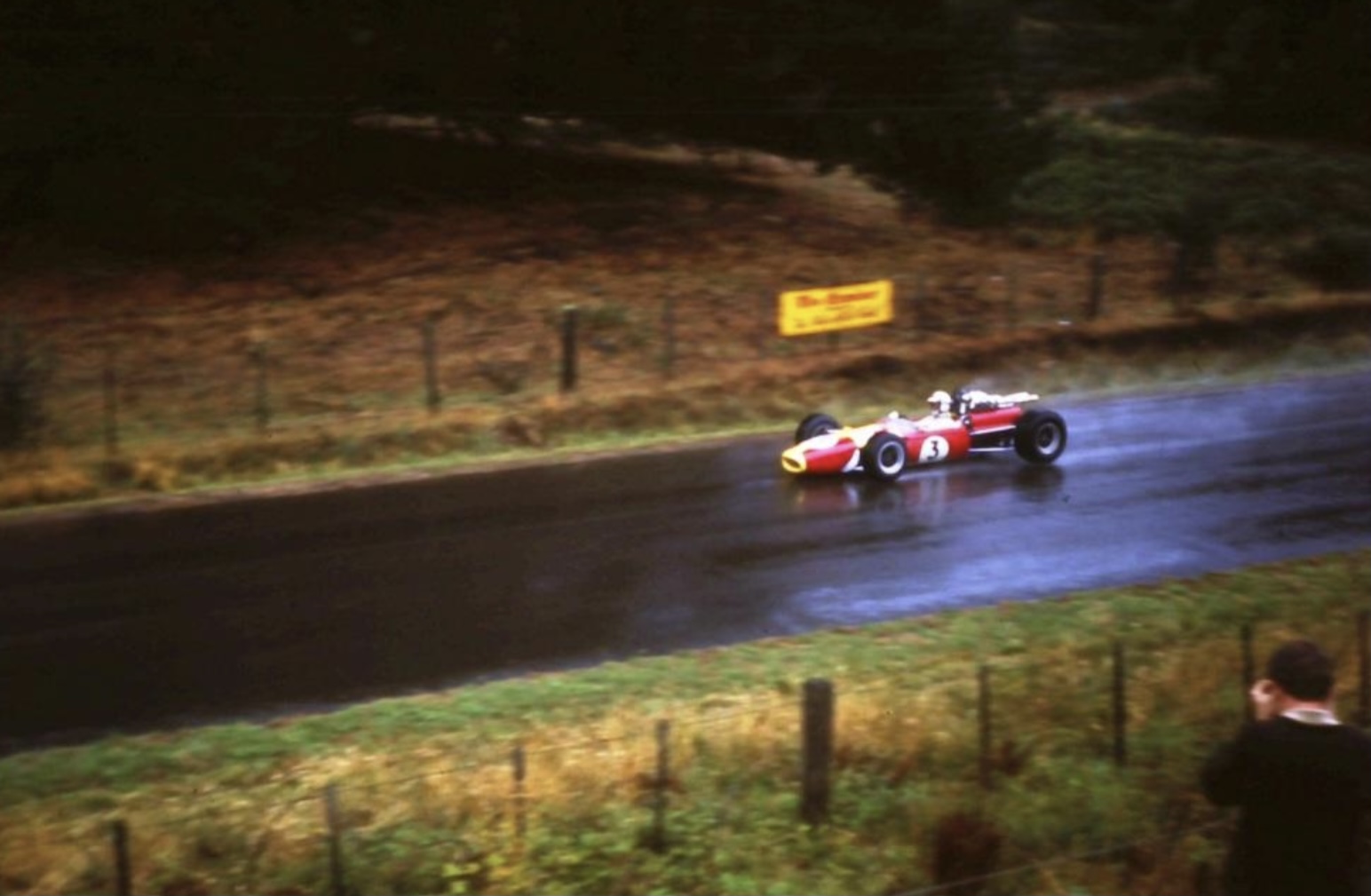 No time to wave to Ron MacKinnon as John plunges past his ‘Mountford’ property on the run down to the Viaduct during the very wet final Longford in March 1968. Not a place for the faint of heart at any time let alone in the pissin’ rain. Brabham BT11A Repco.