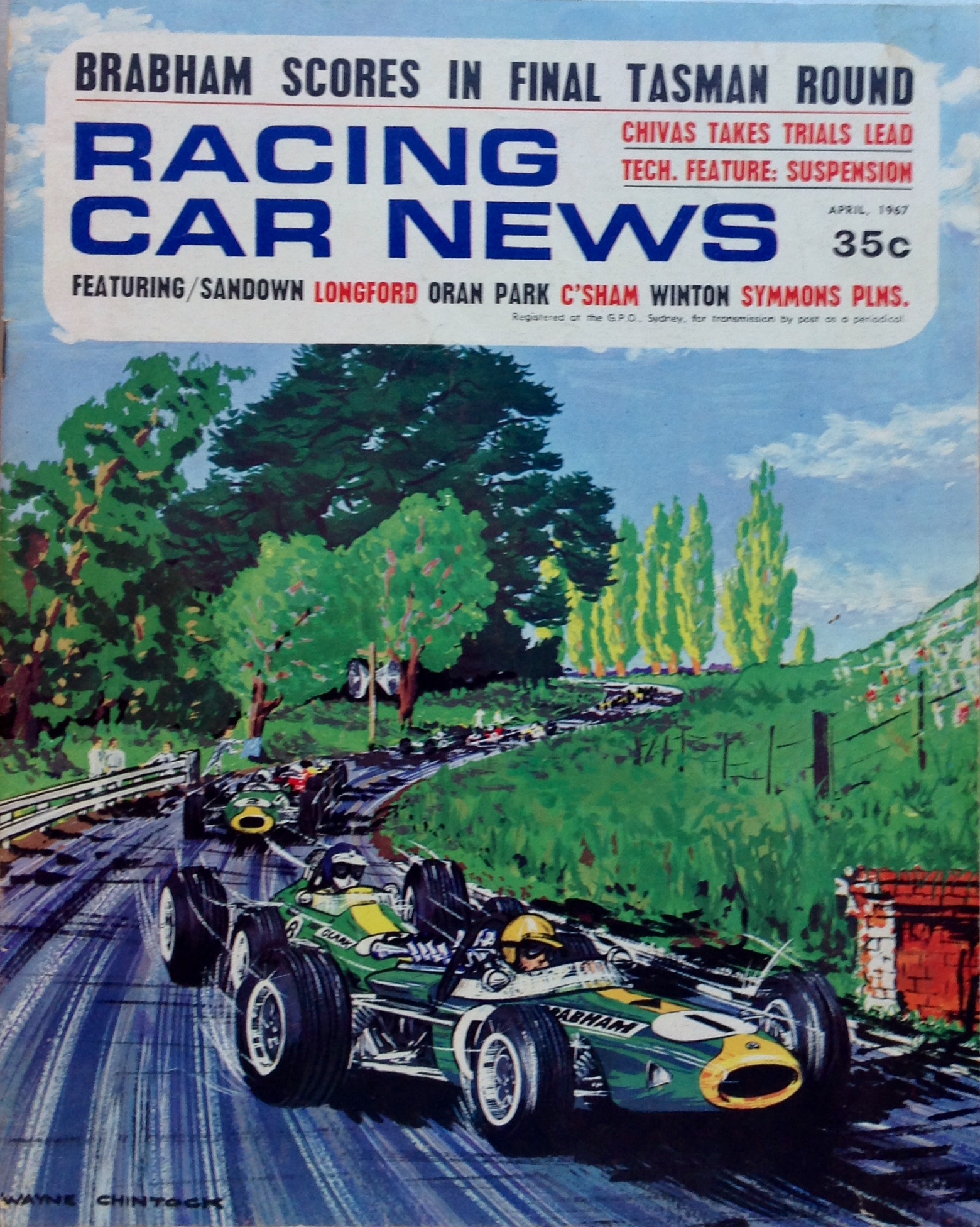 Jack hooks into the Viaduct ahead of Jim and Denny in David Chintock’s impression of the ’67 Longford Tasman round which Brabham’s BT23A won (Wolfe/Racing Car News)