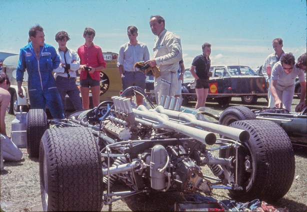 Jim Clark took the 1967 Tasman title in an F1 Lotus 33 fitted with a stretched to 2 litre Coventry Climax FWMV V8 engine, a quick, reliable, well proven combination. Clark took 3 wins, Jackie Stewart 2 in a similar F1 BRM P261. But the stretched to about 2.1 litres P56 V8 stressed the BRM transmission to its limits, the ‘tranny its weakness that summer. Jack was equal 3rd on the points table to JYS with 1 win.