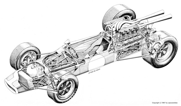 Threatening in an elegant kinda way. You can see what is being sought, ignoring the inherent streamlining difficulties of fully outboard suspension front and rear. Ron went to front inboard springs and rockers with the ’68 Indy BT25 Repco and ’70 F1 BT33 Ford (MotorSport)