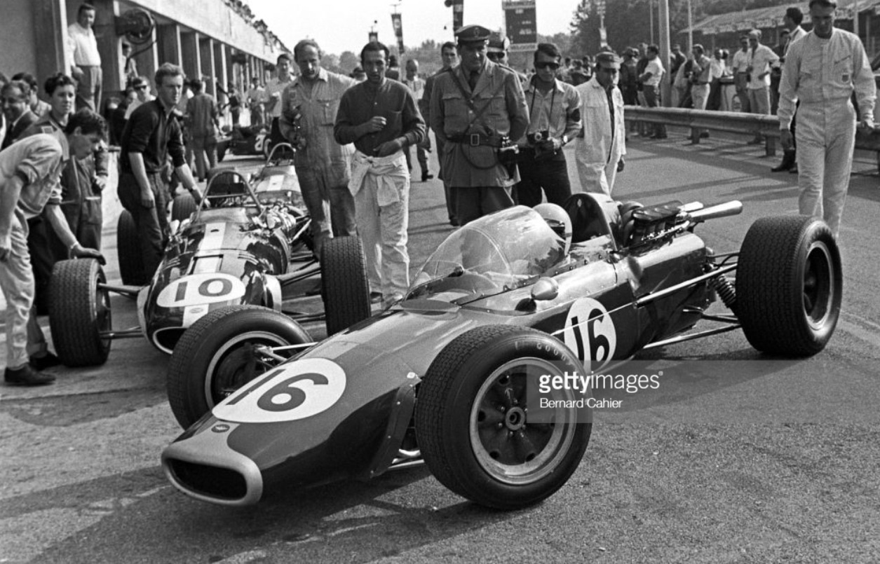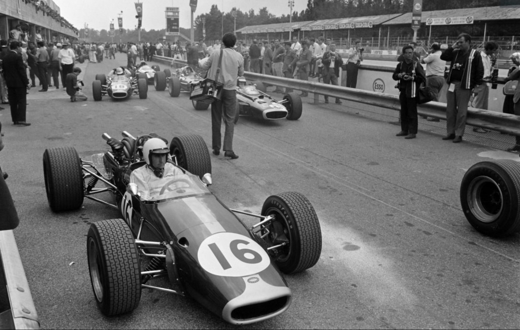 Jack Brabham aboard his Brabham BT24/1 Repco ‘Streamliner’ in the Monza pitlane during the September 10, 1967 weekend.