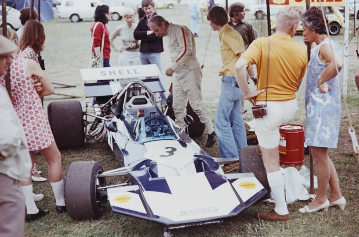 Meanwhile at Warwick Farm John Surtees is looking for a way to get a few tenths out of his Surtees TS8 Chevy F5000 car during practice for the 1971 Australian Grand Prix at Warwick Farm.