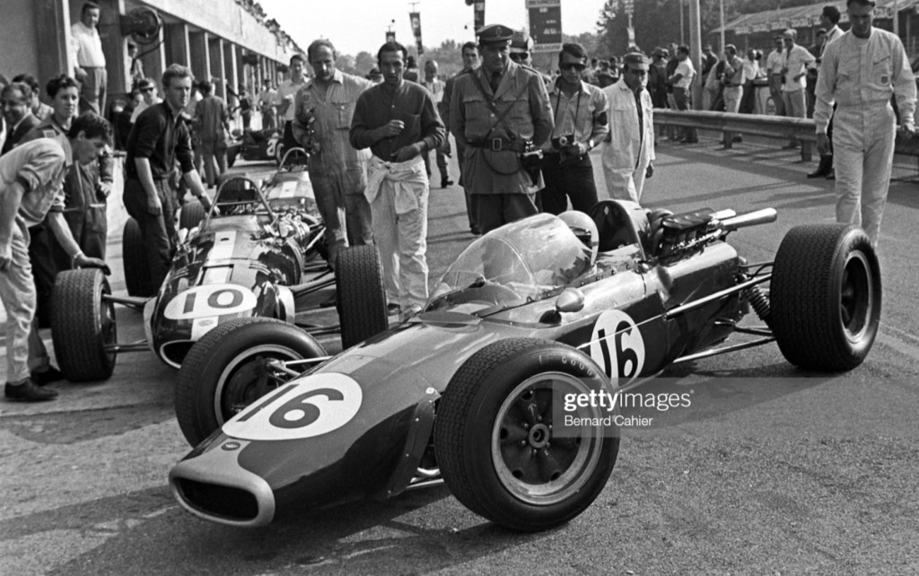 Hulme’s BT24/2 during the British GP weekend (MotorSport)Feel the noise…Monza pit action. Brabham and Denny behind him in the distance. The queue by the Armco is headed by Mike Spence’ BRM P83 H16, Chris Amon’s Ferrari 312, perhaps then one of the Cooper Maseratis (MotorSport)