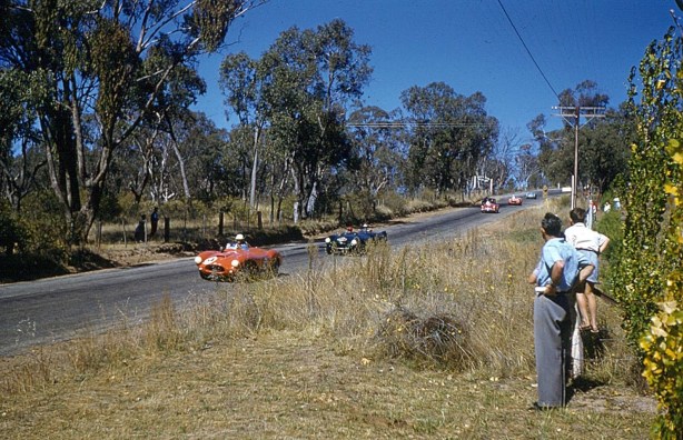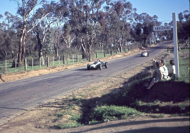 Austin Miller, Cooper T41 Climax leads Bill Patterson, Cooper T39 Bobtail Climax off Long Bridge, Longford during the 1958 Gold Star round won by Ted Gray’s big, booming Tornado 2 Chev. Both of these fellas progressed to T51’s, Patto won the 1961 Gold Star in one of his. He owned more Coopers in Australia than anyone?- perhaps Stillwell and Jones count was similar. Paul England raced Austin’s T41 in the 1957 German GP- DNF distributor after 4 laps