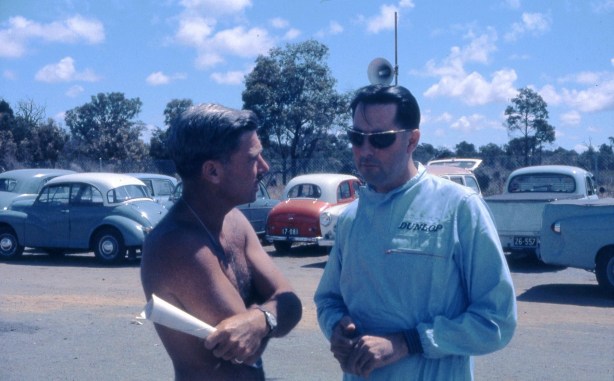 Frank Matich, left and Rocky at Warwick Farm during the Hordern Trophy meeting in December 1964 (autopics)