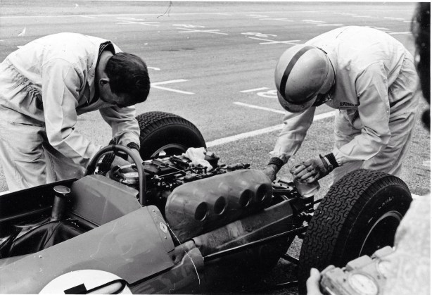 Roy Billington is on the rear wheel of Jack’s Brabham BT11A Climax- the winning car, then the tall Tyler Alexander, Bruce is in the ‘Persil’ white Firestone overalls, Bib Stillwell behind him, Jim Clark, Jack Brabham and David McKay playing with his iPhone. Jack won from Jim and Phil Hill’s Cooper T70.