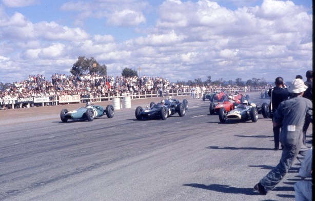 Start of the AGP Longford 1965. Graham Hill BT11A on the right gets away well with Brabham BT11A in the middle and winner McLaren Cooper T79 at left. #8 is Clark’s Lotus 32B, #7 Gardner’s Brabham BT11A, #11 is Phil Hills Cooper T70, #3 Matich BT7A and Stillwell alongside Frank in the dark BT11A, Tresise in #12 T62 is to Bibs left with Bob Jane in the light colored Elfin Mono Ford 1.5 beside and behind Rocky #15 is Jack Hobden’s Cooper T51 and #9 Bill Patterson’s light coloured Cooper T51 (Howard)