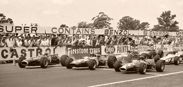 McLaren in the M7A, from pole, Brands Race of Champions in 1968- he won. Alongside is Mike Spence BRM P126, Jackie Stewart Matra MS10 Ford and on row 2 Chris Amon Ferrari 312 and Denny in his M7A. That’s Jo Bonnier in last years McLaren M5A BRM V12 with his hand up on the second last row. Bruce won from Pedro Rodriguez BRM P133 and Denny LAT)