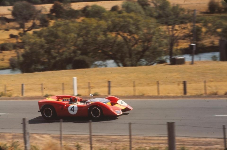 Grant Twining reports that Ian Cook was the quickest of all the Elfin 400 drivers who raced the cars at Longford- Matich (noting the advance in tyres between 1966 and 1968) Jane and Noel Hurd. The photo above is of the front row of the ’68 Longford Tasman sportscar support race- #5 Peter Macrow in the Argo Chev vacated by Cook, Ian in the 400 and Chris Amon on pole in the Scuderia Veloce Ferrari P4/CanAm 350. Amon took the win, am keen to know the placings.