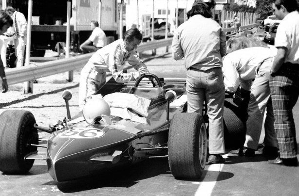Stewart qualified the brave-new-world 2J third behind the dominant orthodoxy, Denny Hulme and Dan Gurney’s new Batmobile-Beautiful McLaren M8D Chevs. Jackie closed on Dan during the race before being forced to pit, then went out for another seven laps – 22 in all – he bagged fastest lap before braking problems ended his race.