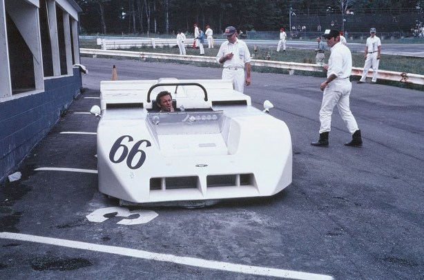 Jim Hall in his 1967 Can-Am challenger, the Chaparral 2G Chev at Bridgehampton. DNF chassis failure. The McLaren M6 Chevs were dominant that year, Robin Herd, the M6 designer freely acknowledged the effect Halls’ designs, especially the 2E, the first car with the high wing had on him. Hulme won the race in his M6A. (Pete Lyons)