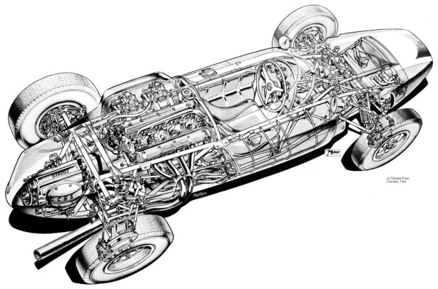 Fundamental design tenets were laying the driver down to aid aerodynamic efficiency, a coil sprung rear end (Charles Cooper fought a pitched battle on this score Nye records by insisting that a transverse leaf rear also be designed should the coils fail), greater torsional stiffness and an improvement in performance around the T51 ‘weak tracks’ which included fast places like Reims and the Avus.