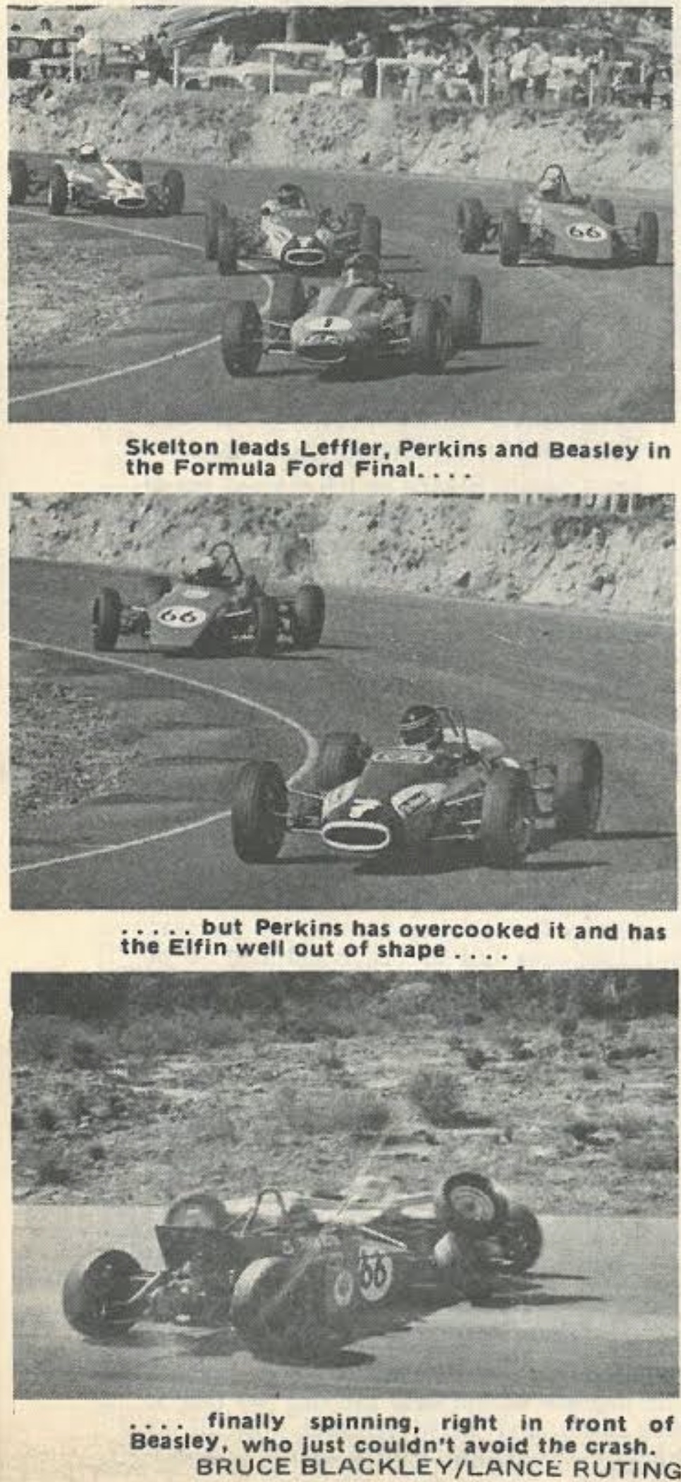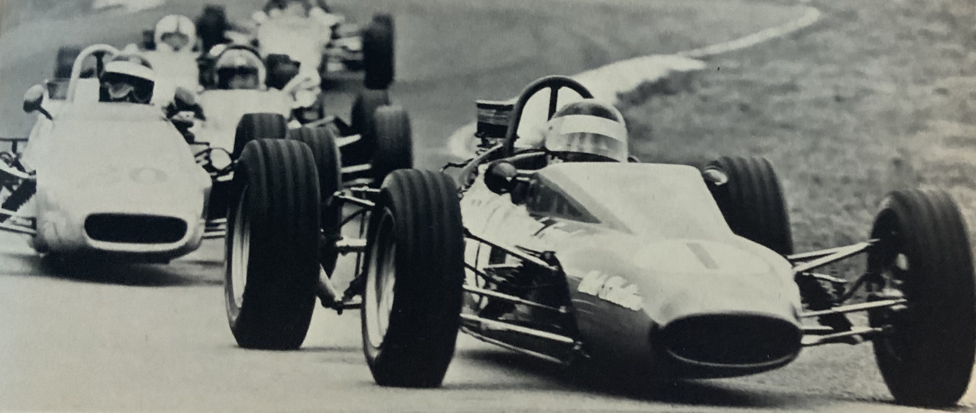 ‘However, KB hit a patch of water and spun off while Walker, trying to avoid the red Lola, speared off into the long grass on the inside of the circuit, heading for Len Lukey’s cow sheds. Bartlett was the first to recover and regained the circuit to win by 23 seconds from John McCormack, with a very angry Johnnie Walker filling third place in a Lola with a very battered nose.’