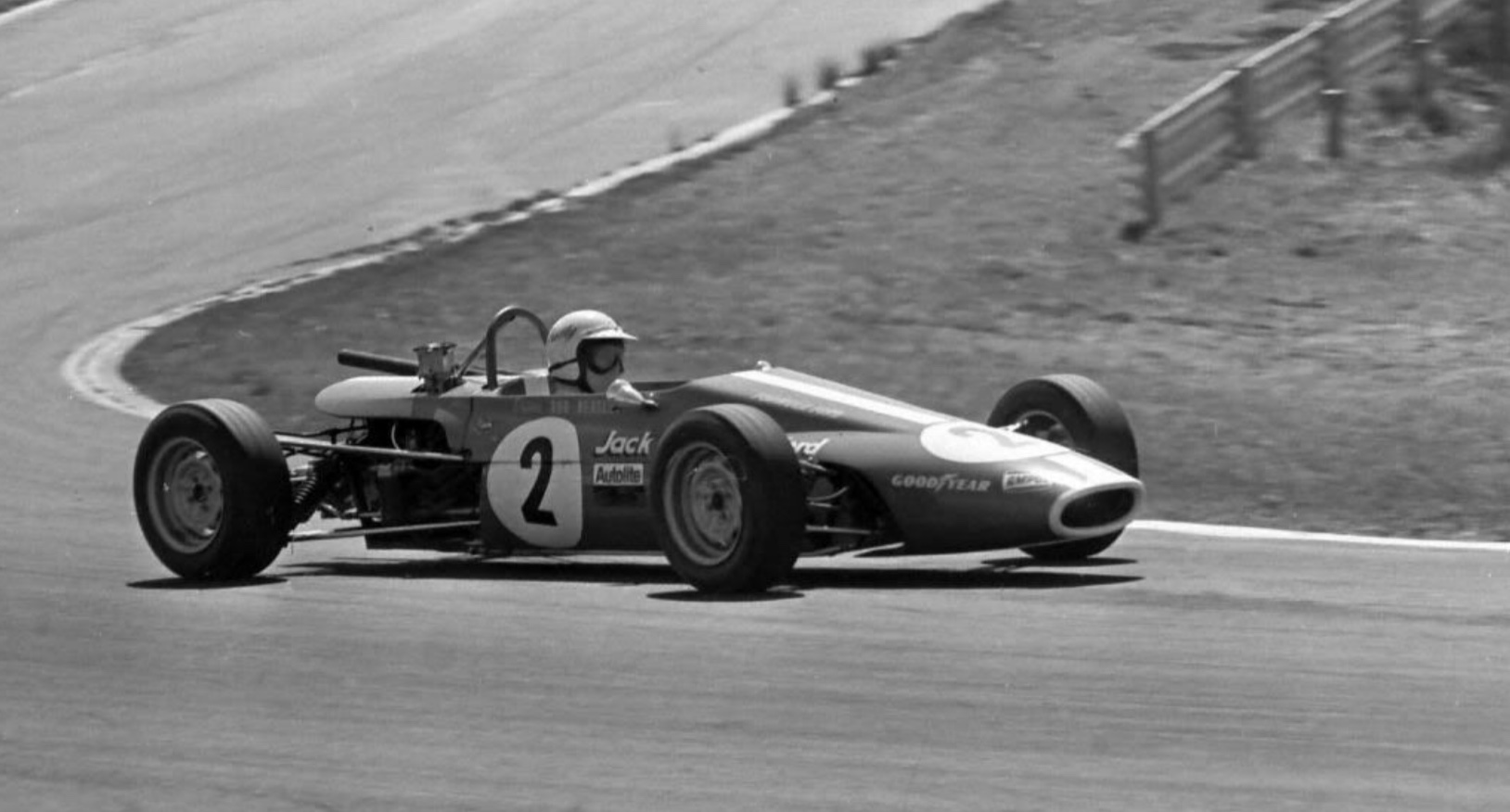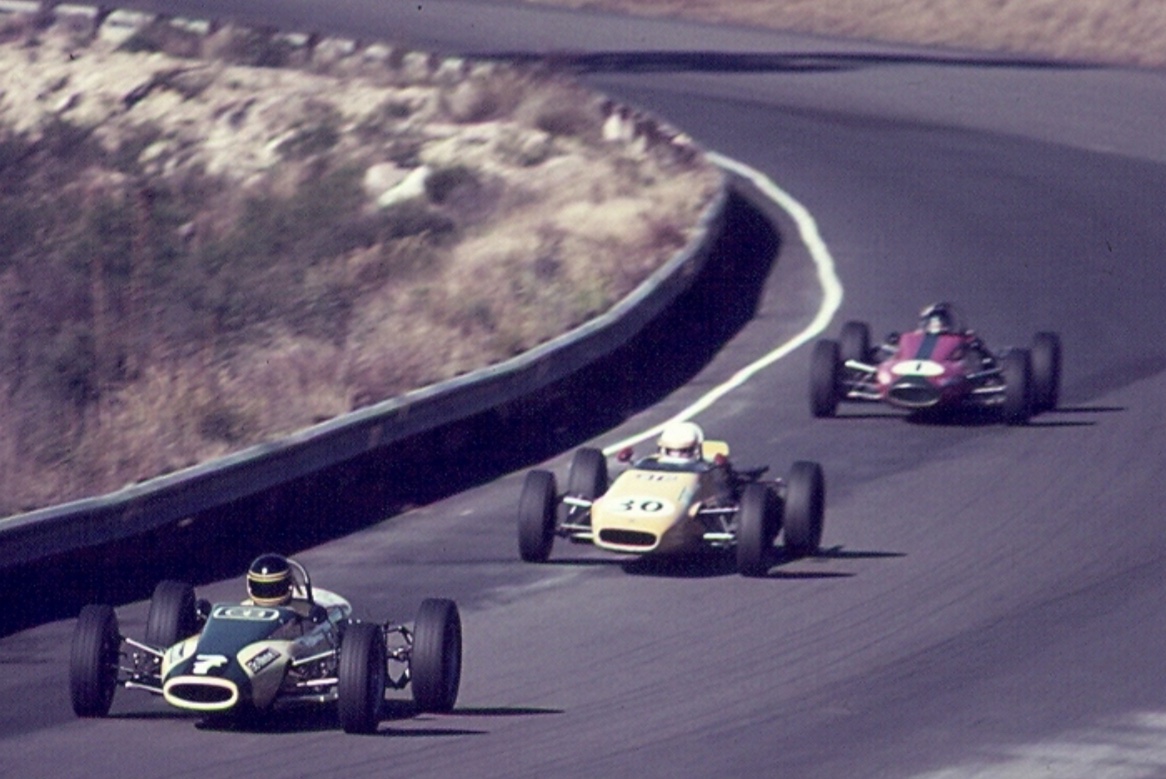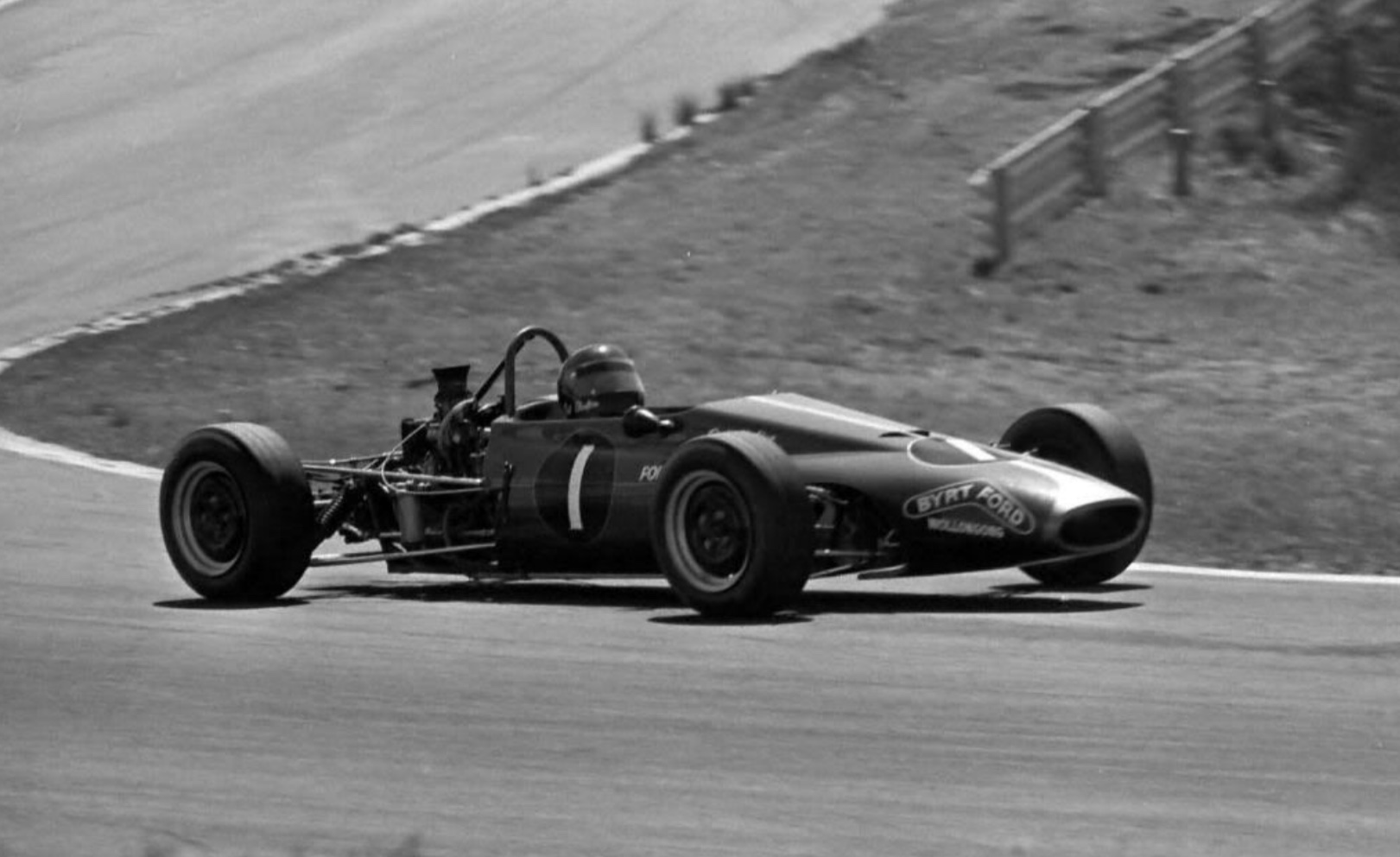 Enno Buesselmann retired his Elfin 622 Lotus-Ford ANF2 car after a dive under Graeme Lawrence at Firestone didn’t end well; he speared off onto the swamplike infield from which there was no escape.