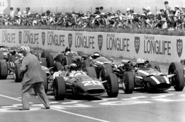 Toto Roche moves out of the way at the start of the 1966 French GP- Bandini’s Ferrari 312 is on pole with Surtees Cooper T81 Maserati alongside and out of shot to the right is Parkes in the other works Ferrari. Brabham won from Parkes and Hulme, Brabham BT20 Repco. Surtees and Bandini both DNF. Jack is behind Bandini and Rindt in the white peaked helmet in another T81 Cooper with Graham Hill’s distinctive helmet behind Jochen- BRM P261 (LAT)