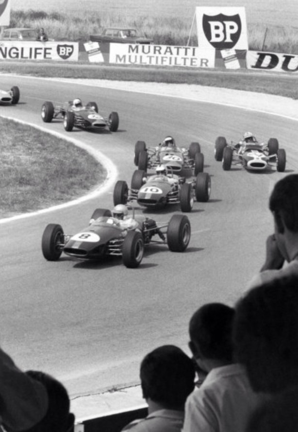 There his Cooper T81 Maserati failed to finish with problems, (a small shaft driving the mechanical fuel pump sheared on the first lap but he ‘shoved it right up’ Ferrari by popping the unfamiliar and undoubtedly less competitive car second on the grid- behind Bandini’s Ferrari 312 on pole.