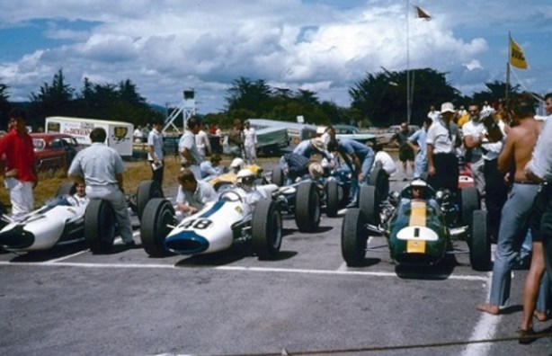 Start of the 1965 NZ GP at Pukekohe, winner Hill on the outside, Clark in the middle and Lex Davison on the inside- Brabham BT11A, Lotus 32B and Brabham BT4 all Coventry Climax FPF powered (unattributed)