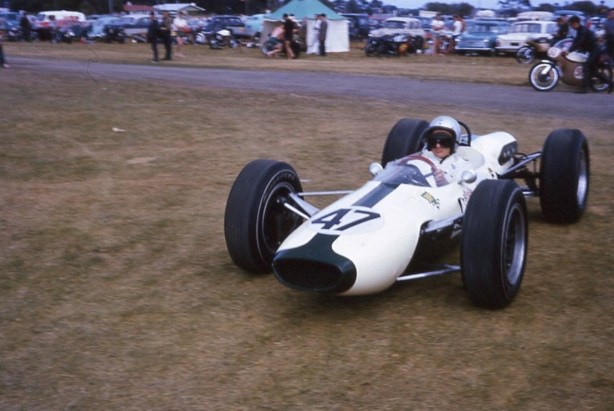 Frank Gardner’s Mildren Brabham BT11A Climax being pushed onto the grid. The lanky chap at the back is Glenn Abbey, long time Mildren and Kevin Bartlett mechanic (Fistonic)
