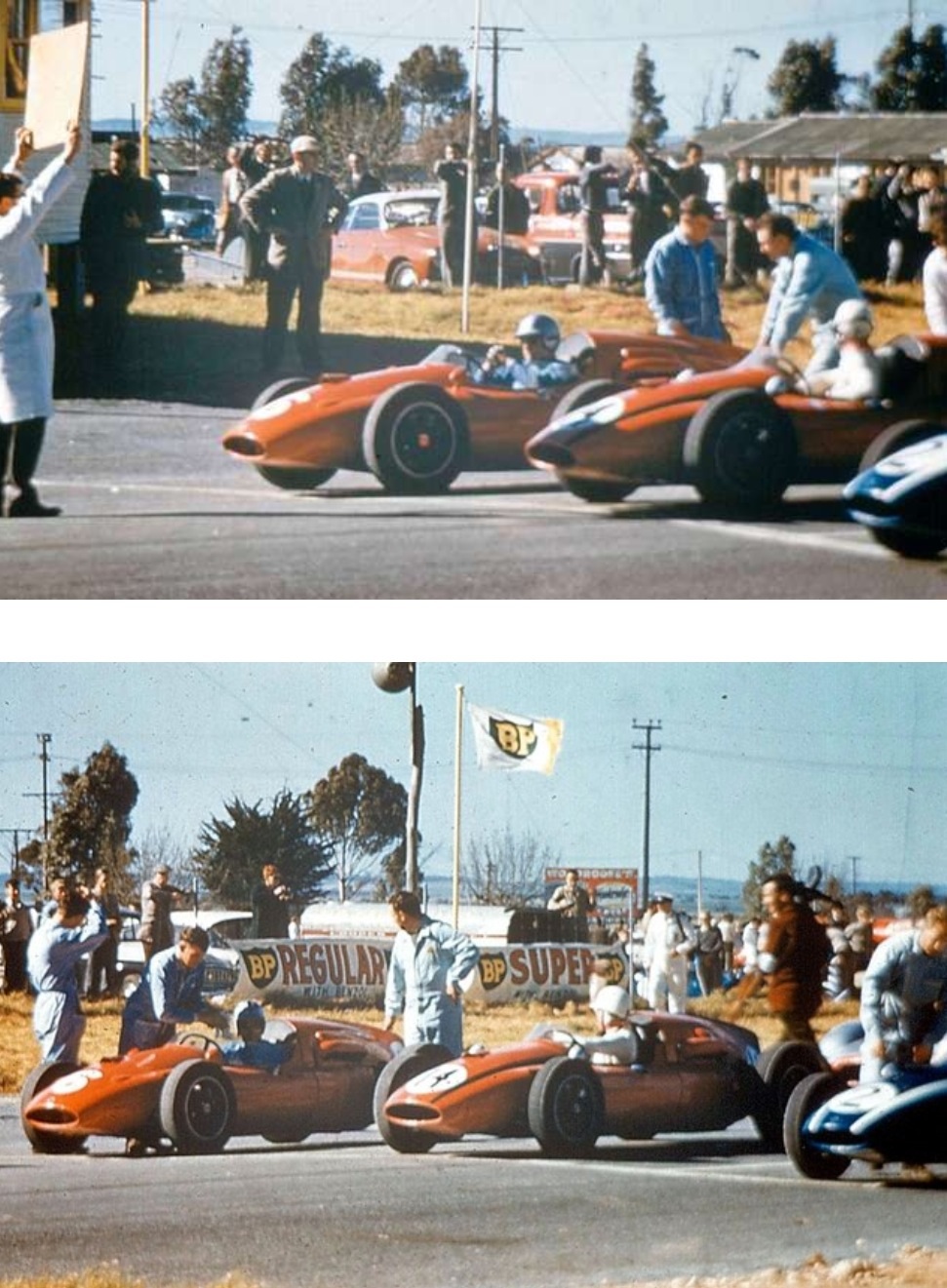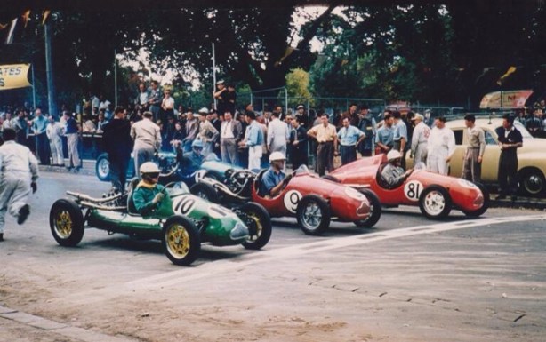 Gaze’s VPA9 is at left alongside Peter Whitehead’s Cooper T38 Jaguar, David McKay’s first Aston Martin DB3S and Stirling Moss’ 1956 NZ GP winning Maserati 250F.