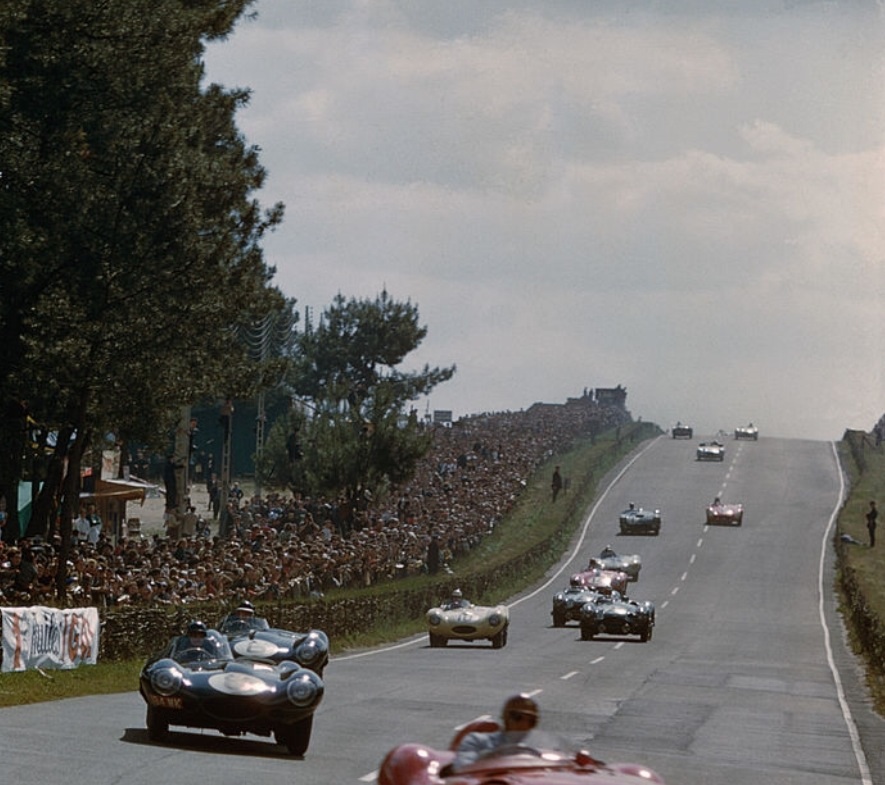Umberto Maglioli’s head in his Ferrari 118 LM ahead of the Beauman, Hawthorn and Jacques Swaters D Types during the early laps of the 1955 Le Mans 24 Hours (Klemantaski)