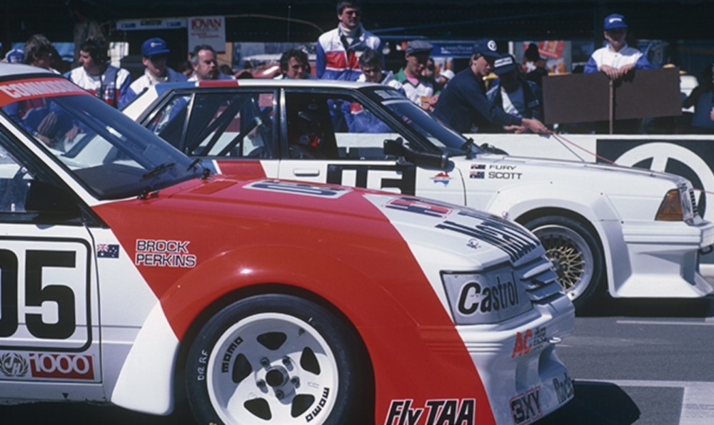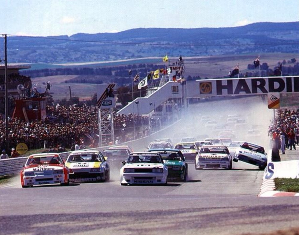 Lap 1 into Hell Corner: Fury Nissan from Brock VK Holden Commodore, Johnson XE Ford Falcon, Allan Grice white/yellow VK Commodore with Richards BMW 635 CSI and Masterton’s XE Falcon putting the squeeze on Moffat’s Mazda RX7. First start, race restarted and Brock got the jump (supercars)