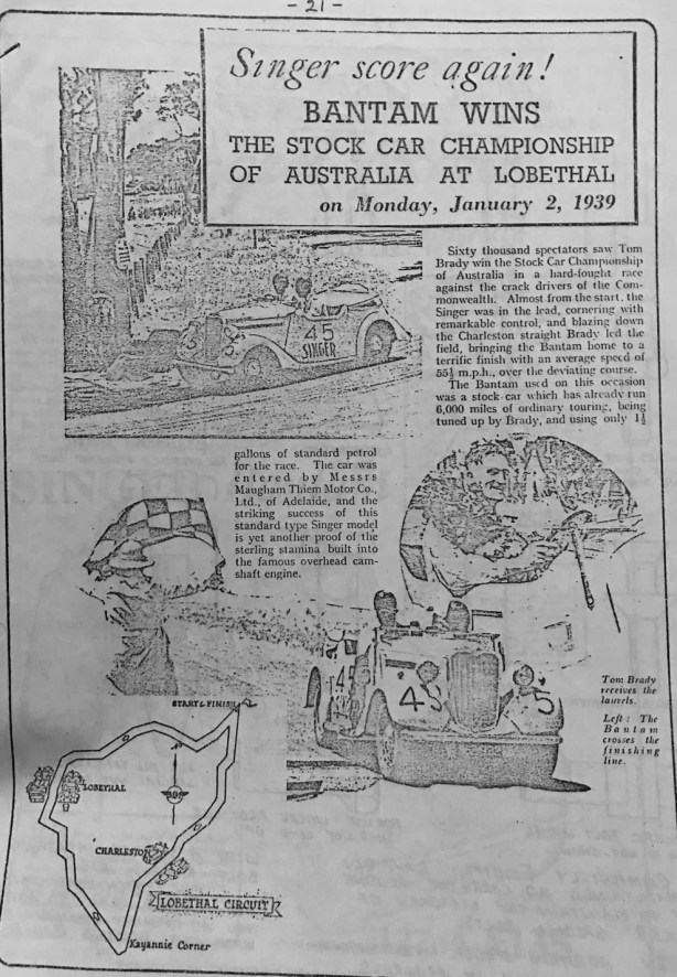 And so my friends, I put it to you that the one race, 50 mile 1939 Lobethal ‘Australian Stock Car Road Championship’ contested by thirteen or so cars and won by Tom Bradey’s Singer Bantam are indeed the first ATCC champion driver and car- official or otherwise.