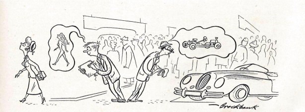 The 1960’s English editor of Automobile Year recalls he was a fairly well known motoring artist when Brockbank asked for his advice on how to break into the automotive business over a post Donington meeting drink. Confronted by such brilliant competition, Gordon Wilkins thought he showed sound sense in deserting art for writing.