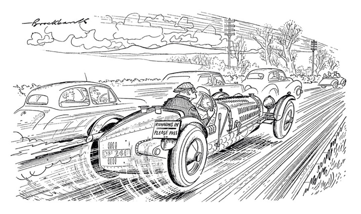 By 1949 he was the Art Editor of Punch. His passion and knowledge of cars and motor racing shines through in the technical accuracy of his work as do his characters-Major Upsett with his outmoded ‘tache and clapped out Austin 8. Not to forget the ‘Old Biddy’ haranguing her long-suffering husband, the Rolls driver and Latin racing drivers. Nothing missed his eagle eye.