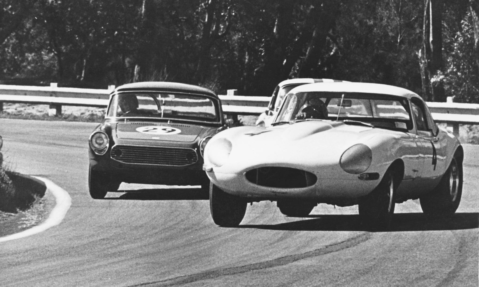 Appendix J tustle into Mountford Corner circa 1964- Alan Robertson’s Peugeot 203 dives under an FJ Holden, the finish line is only 500 metres away, perhaps this is a last lap lunge…