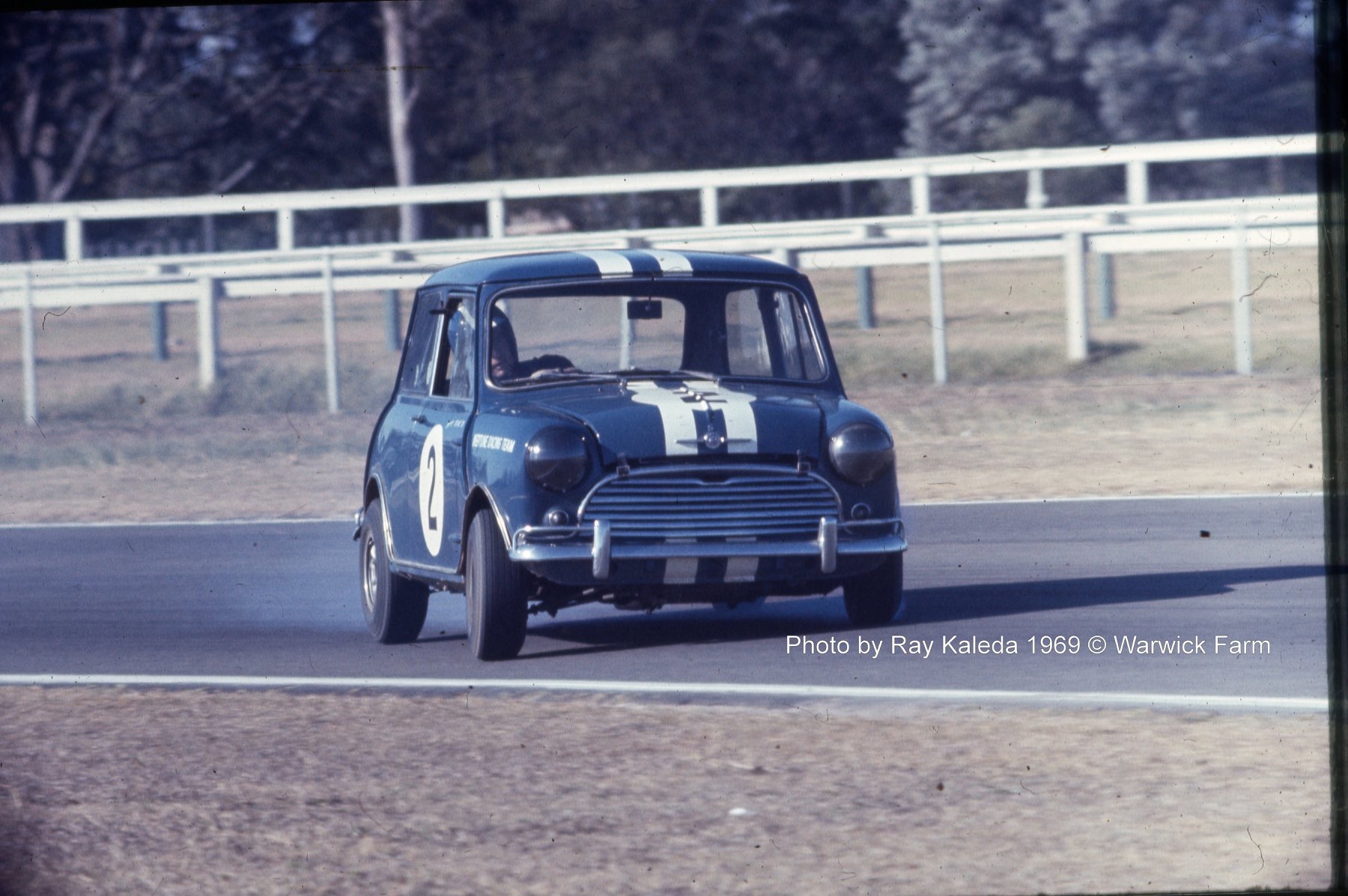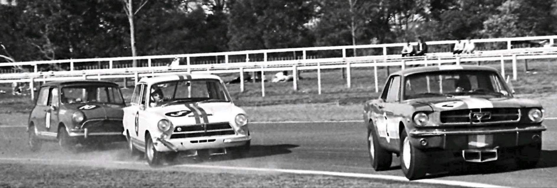 The July 1965 Oran Park meeting program shows Harvey’s Austin Cooper S ahead of George Garth’s Ford Cortina GT during the OP May 1965 meeting.