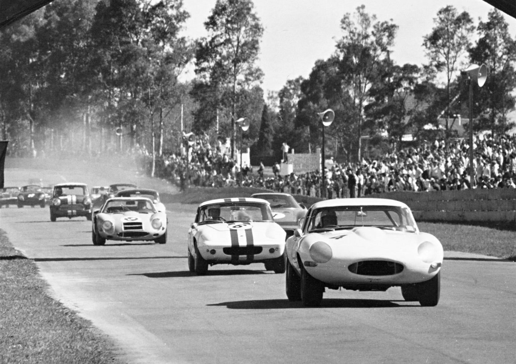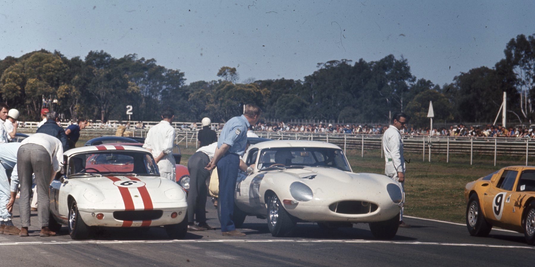 Hume Weir front row of the sportscar feature, Queens Birthday weekend June 1967. Alan Hamilton’s white Porsche 906 Spyder, Spencer Martin in the Jane Elfin 400 Repco and nearside Bevan Gibson Lotus 15 Climax (M Leirsch)