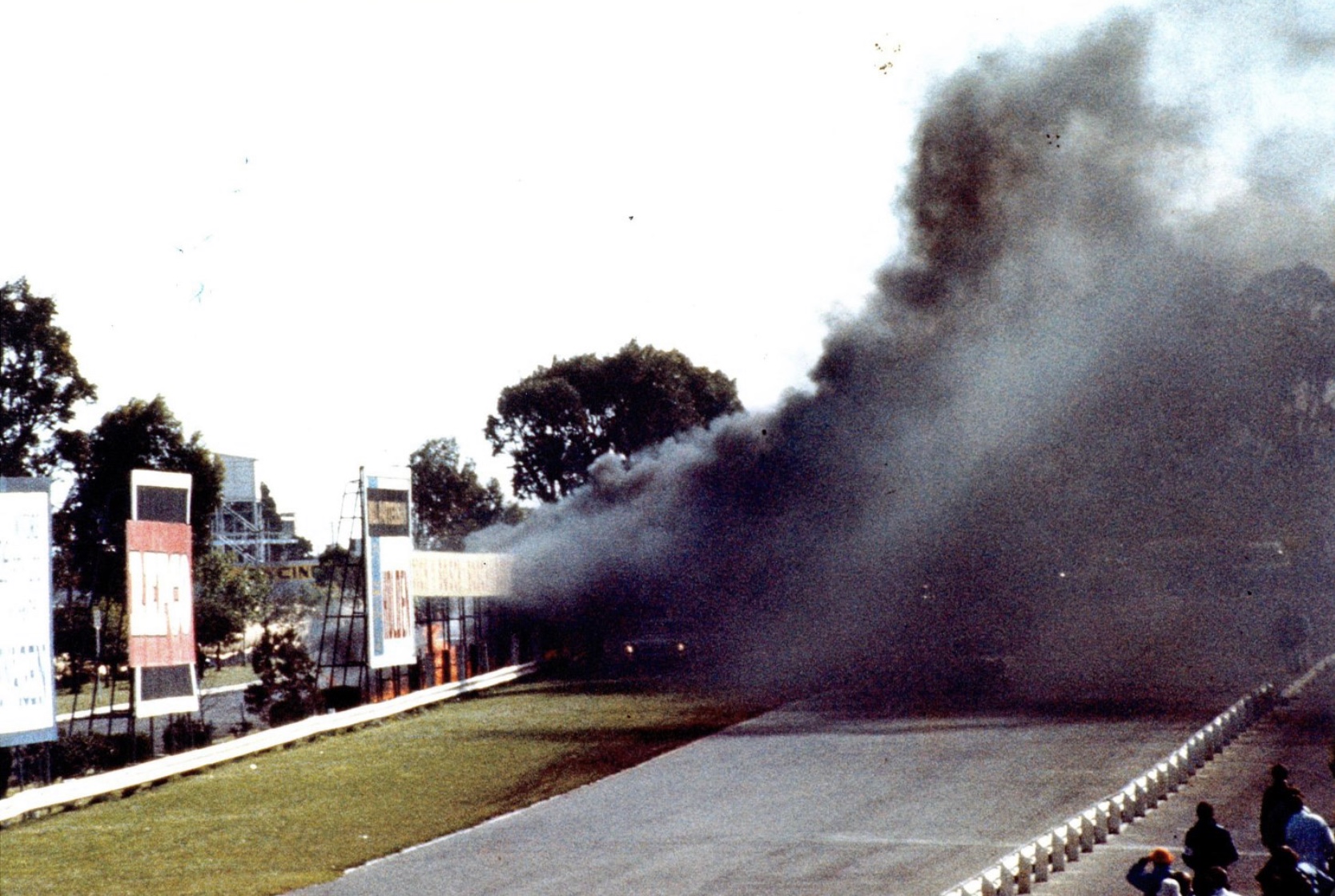 ‘So Bevan drafted Frank down the straight. He seemed to me to pull out just before the last hump. He pulled out to get the run down the inside of Murray’s Corner, and beat Frank under brakes. I suppose they were travelling at 160-170mph, and Bevan had pulled out just before the last hump. When Bevan hit the fresh air the car seemed to accelerate. The Elfin lifted, went up in the air, and came to earth upside down. The car almost instantly caught flames, and that was that’.