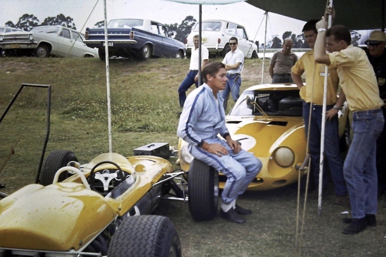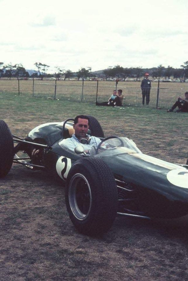 Jack aboard a Brabham Viva at Longford in 1967- Ford jacketed Denny Hulme looks on from the right