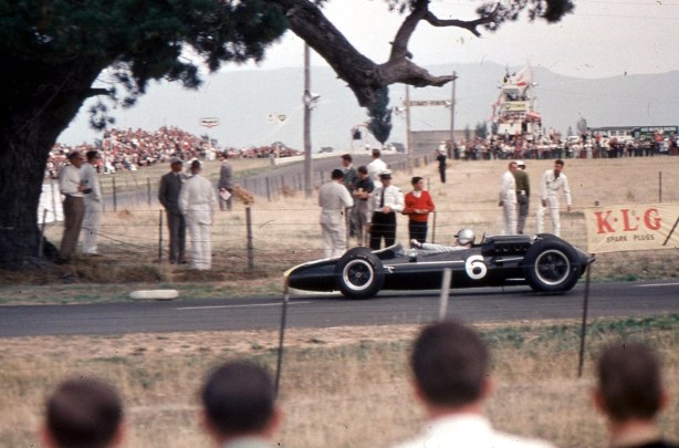 Look very carefully to the left and you can just see a couple of jousting Scots- Jim Clark’s Lotus 39 Climax is just in front of South Pacific Trophy winner, Jackie Stewart in a BRM P261 1.9 litre V8.