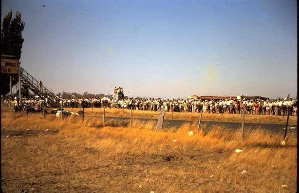 Ian Cook accepting the plaudits of the unruly but respectful! Warwick Farm crowd, February 1968. Elfin 400 Repco (D Harney)