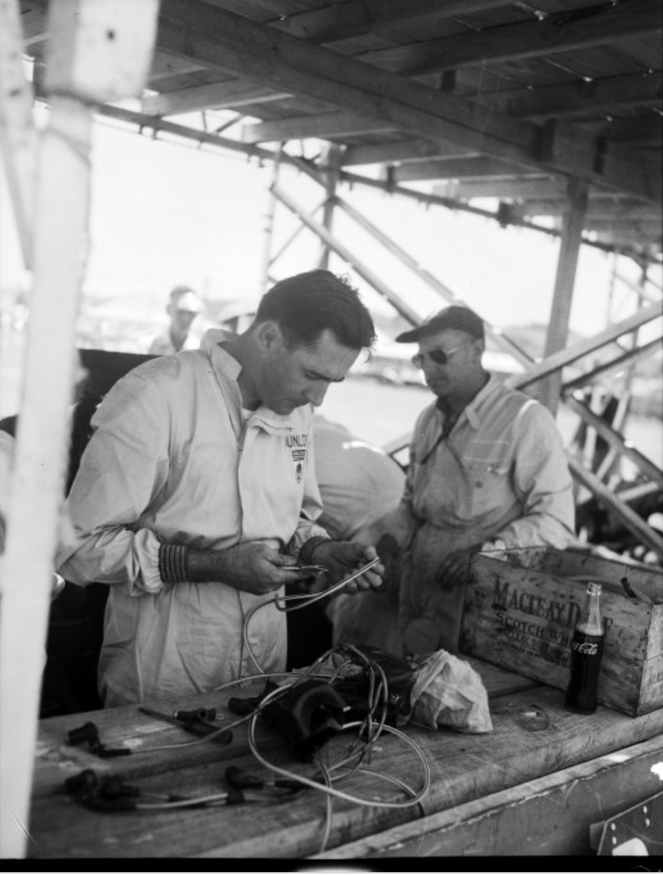 All of the valves were replaced but it was discovered that the water passages did not line up. The gasket was predicted to have a short life so runs on the Ten Mile Circuit started early in the cool of the day, the driving chores shared by Carroll Shelby and Roy Jackson-Moore.
