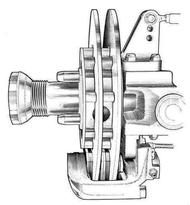 Doug Nye explains the set-up, “There were twofold discs on each hub, spaced by a double thickness of pad material, and with pistons on only one side of the caliper. The discs were given a degree of side-float which allowed them to move sideways, cramped by the pads, when the brakes were applied. The idea was to double pad and disc area and provide better heat dissipation plus the opportunity to reduce line pressures which permitted the use of smaller pistons and less deflection on pad wear. The problem had been that conventional discs were wearing the brake pads into a taper form. This in turn promoted knock-off when the drivers braked hard, giving a spongy pedal feel and slashing driver confidence.”