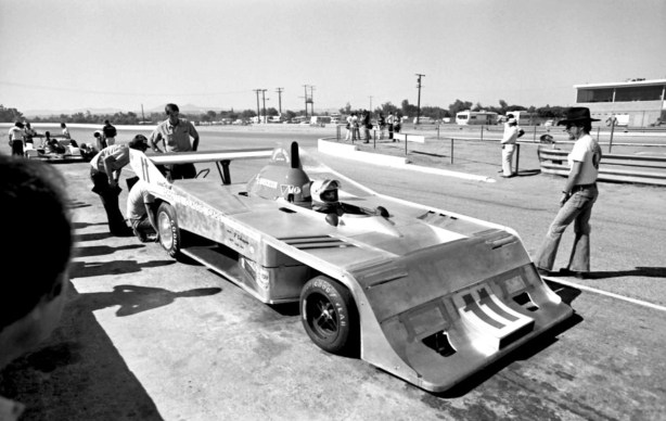 Vern in a sports car of a completely different type, an Elfin MR8C Chev F5000 converted into a central seat Can-Am machine, here at Riverside in 1977, resplendent in brand new John Webb aluminium bodywork. I’ve prattled on about this car before, see here: https://primotipo.com/2018/10/02/hit-with-the-fugly-stick/
